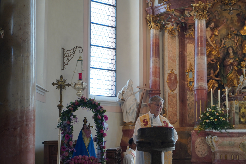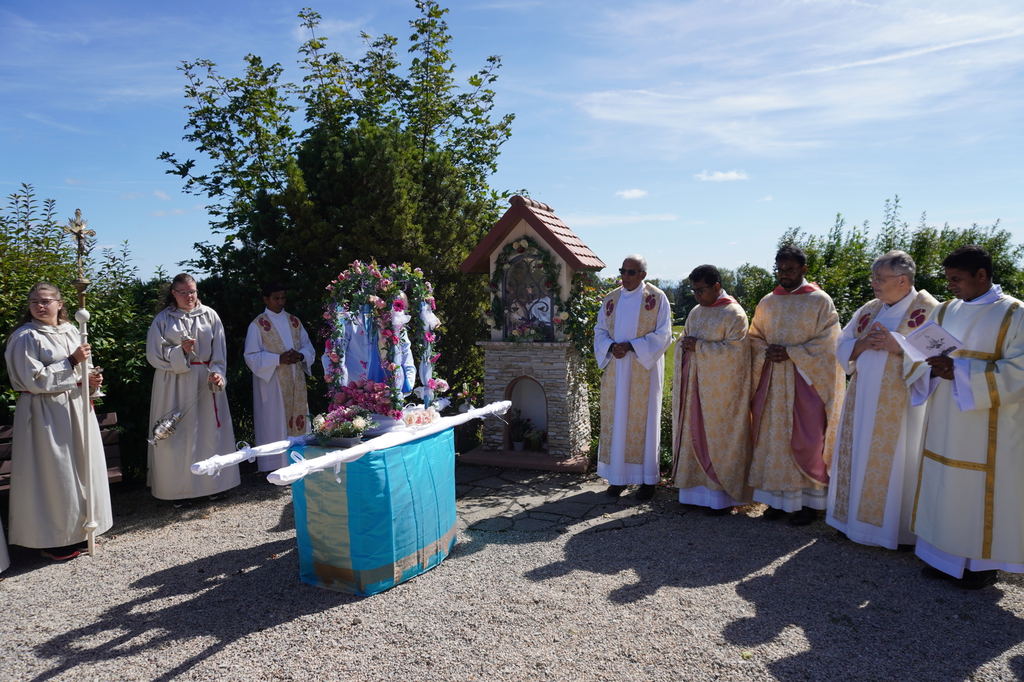 Nach der heiligen Messe zogen die Gläubigen in einer feierlichen Marienprozession betend und singend über den Berg. Mit dem sakramentalen Segen endete die Prozession, bevor die Gemeinschaft zu einem Stehempfang einlud, bei dem Begegnung und Austausch in froher Atmosphäre möglich waren.